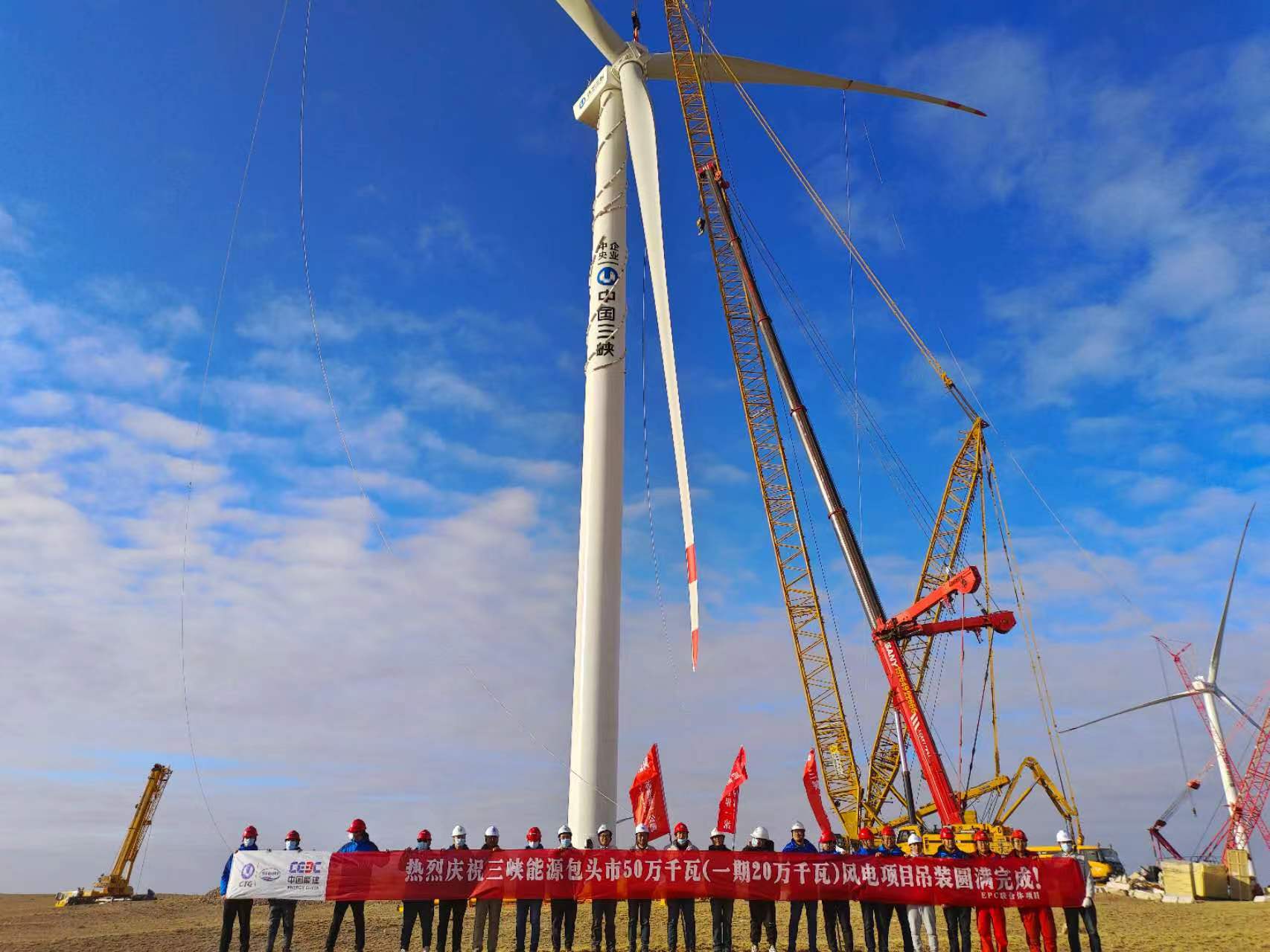 包頭市可再生能源綜合應(yīng)用示范區(qū)1號50萬千瓦(一期20萬千瓦)風(fēng)機全部吊裝完成。鄭泰博攝