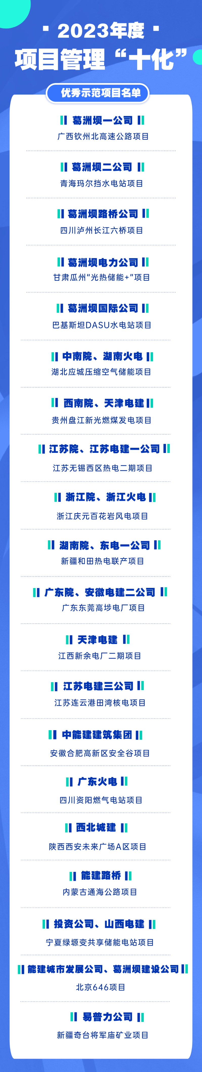工程項目是企業發展的命脈,是價值創造的源泉,是品牌提升的“硬公關”。2023 年,中國能建以“項目履約提升年”專項行動為契機,全級次狠抓項目管理“十化”落地,深入開展優秀示范項目的創建工作,持續推動項目管理向科學化、數字化轉變。為表彰先進、樹立典型,經所屬企業推薦、公司組織評選,決定授予20個項目“2023年度項目管理‘十化’優秀示范項目”榮譽稱號。