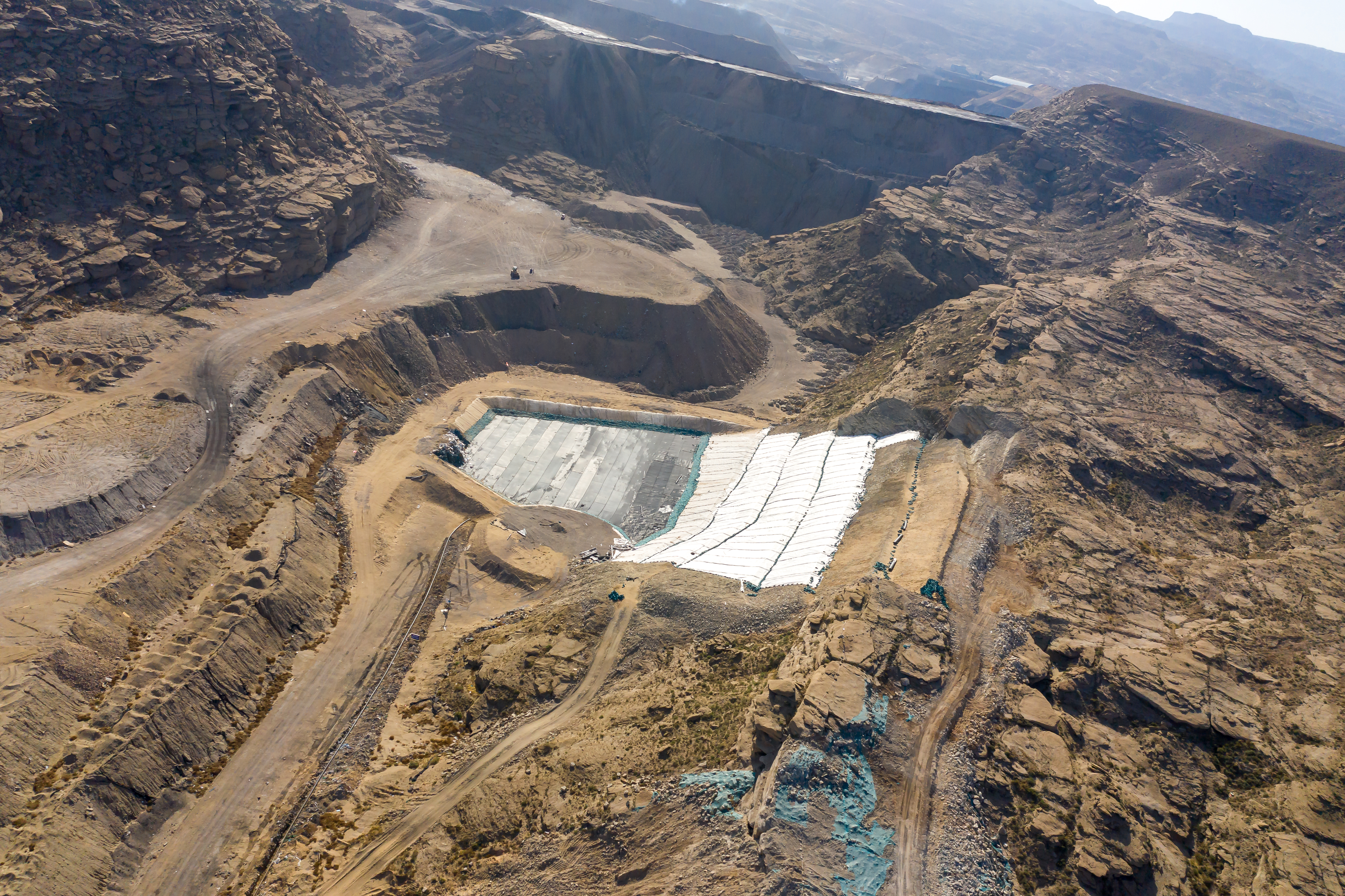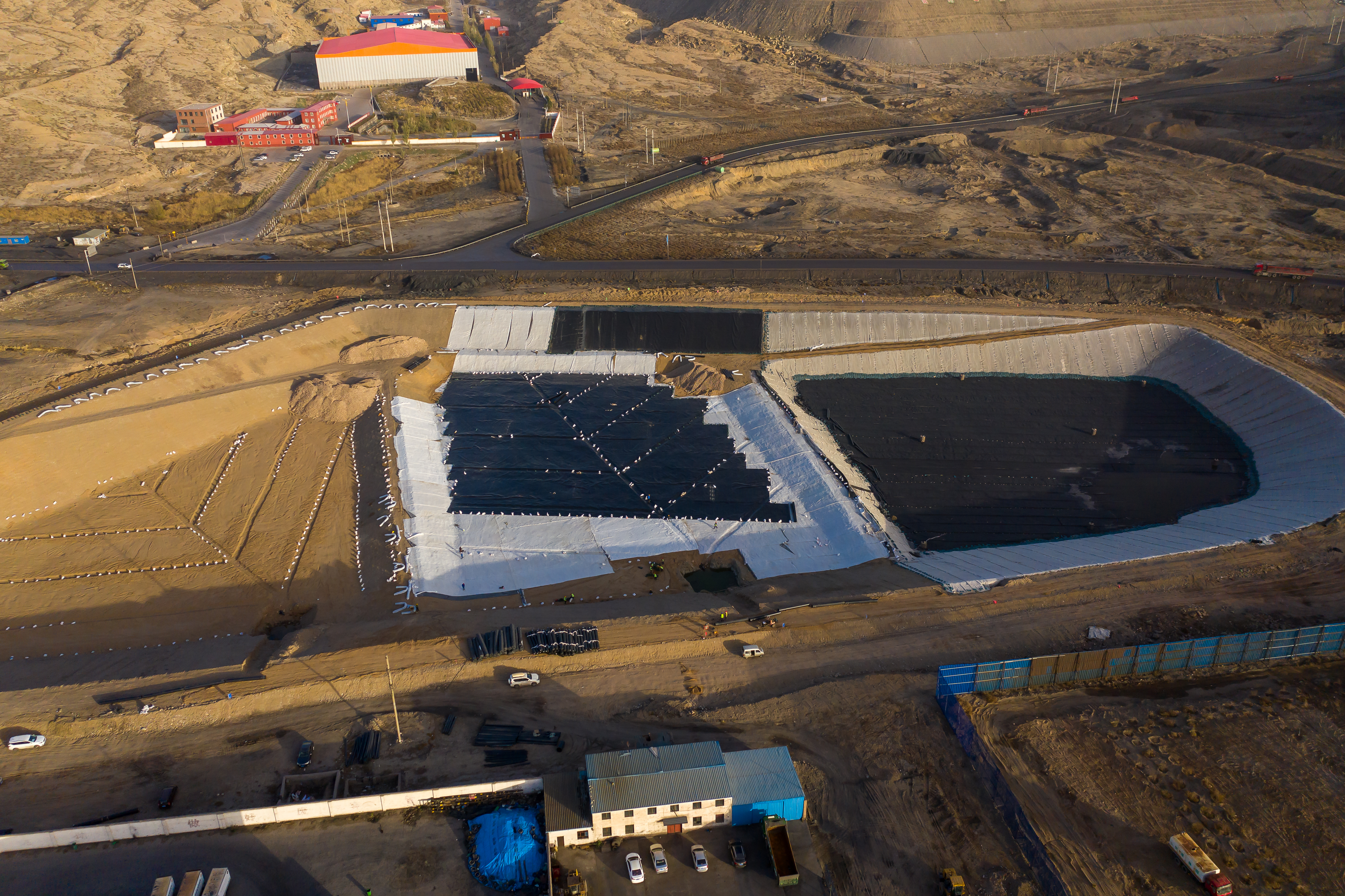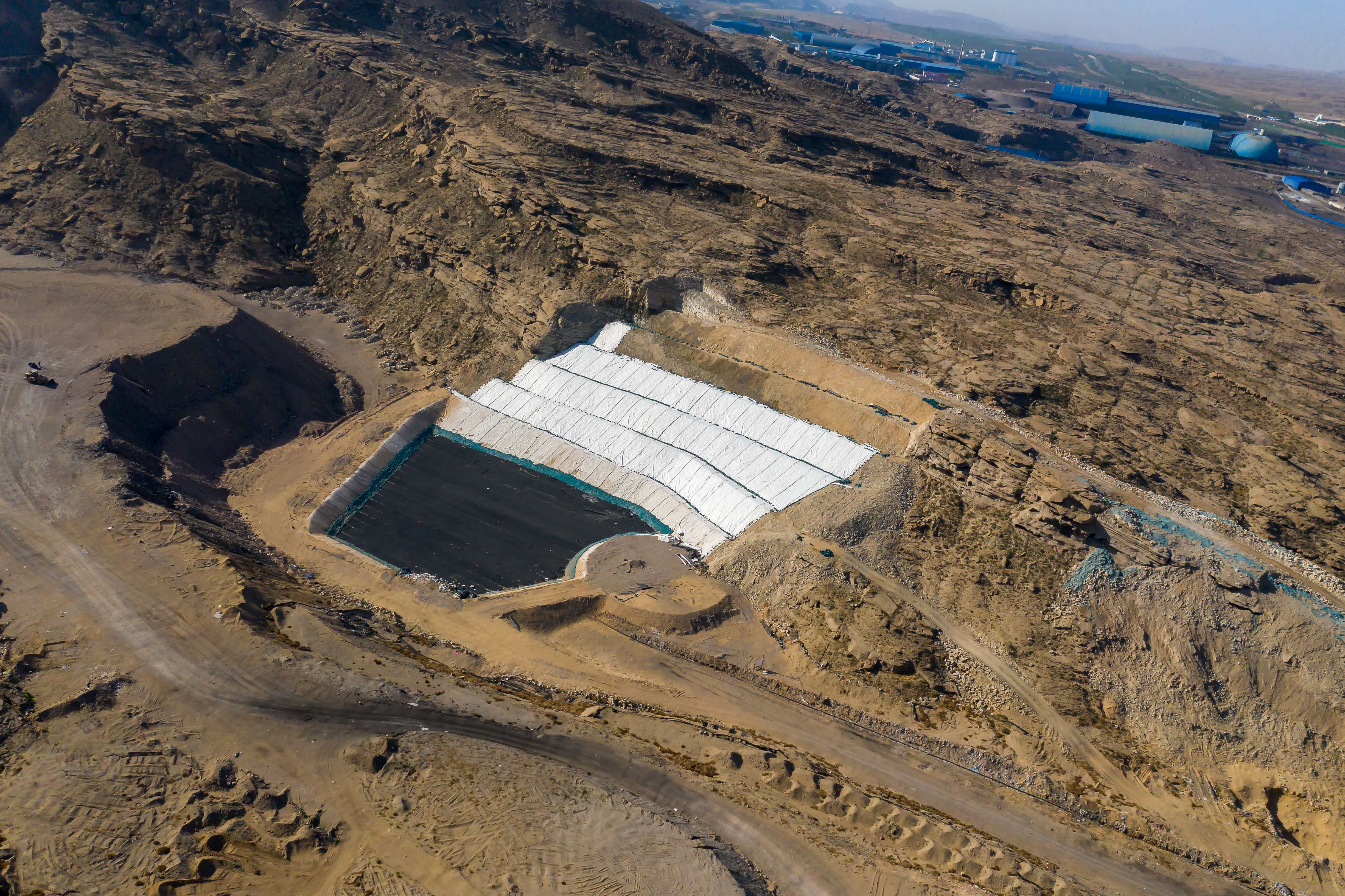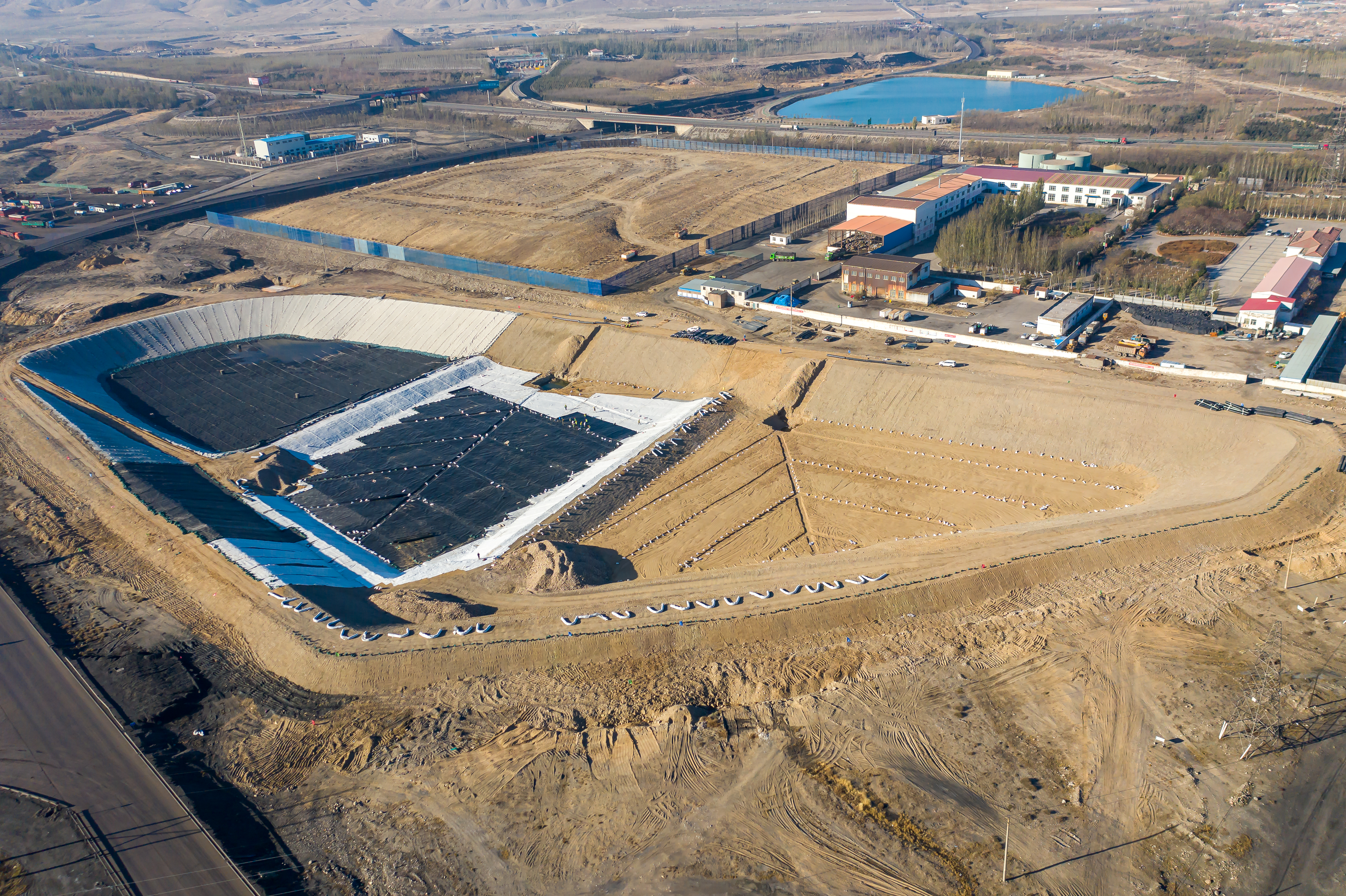 北風呼嘯,烏海垃圾處理新建工程項目部下足繡花功夫給垃圾消納場披上高韌性的黑色斗篷一面在兩層長50米,寬8米,厚2毫米的HDPE防滲膜之間填充高強度的網格作為支撐,保證防滲效果,讓滲濾液能夠按照既定軌道輸送到排水盲溝后再進行降排降污處理;一面在HDPE防滲膜表面覆蓋石子導流層和土工濾網,以實現垃圾儲存和滲濾液運輸兩者的分離,防滲層猶如裝上雙重密封保險。