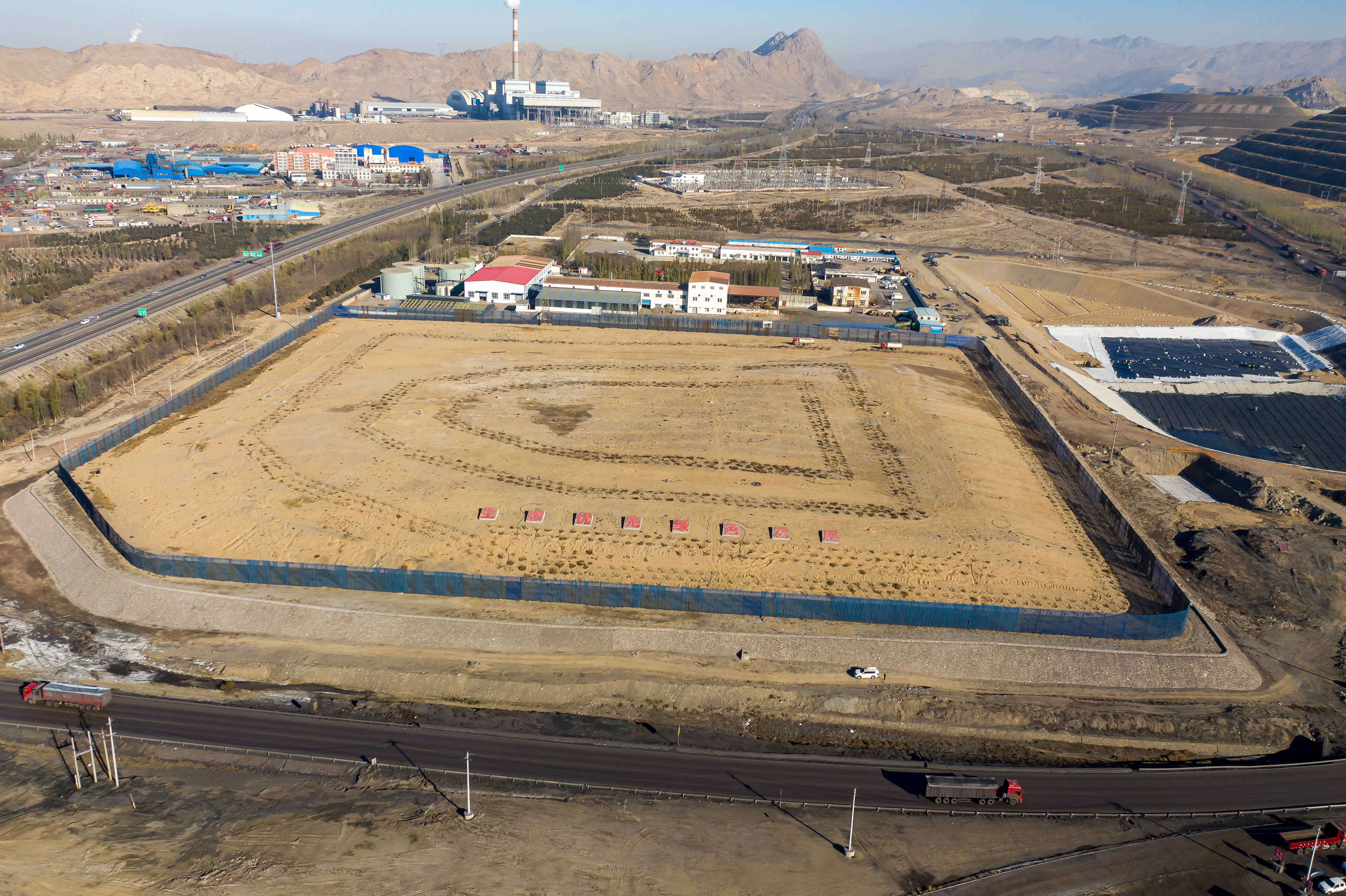 黃沙漫天,使命在肩。烏海市海渤灣區新建建筑垃圾消納場一期(EPC)項目地處鄂爾多斯高原西北部,烏蘭布和沙漠南緣的河谷內,是按國家標準生態規范設計建設的無害化建筑垃圾消納場,占地面積約35.25萬平方米,項目建成后,將對市內產生的建筑垃圾實行減量化、資源化、無害化處理,有效減少水土、大氣污染,進一步美化區域環境,提升城市整體形象。