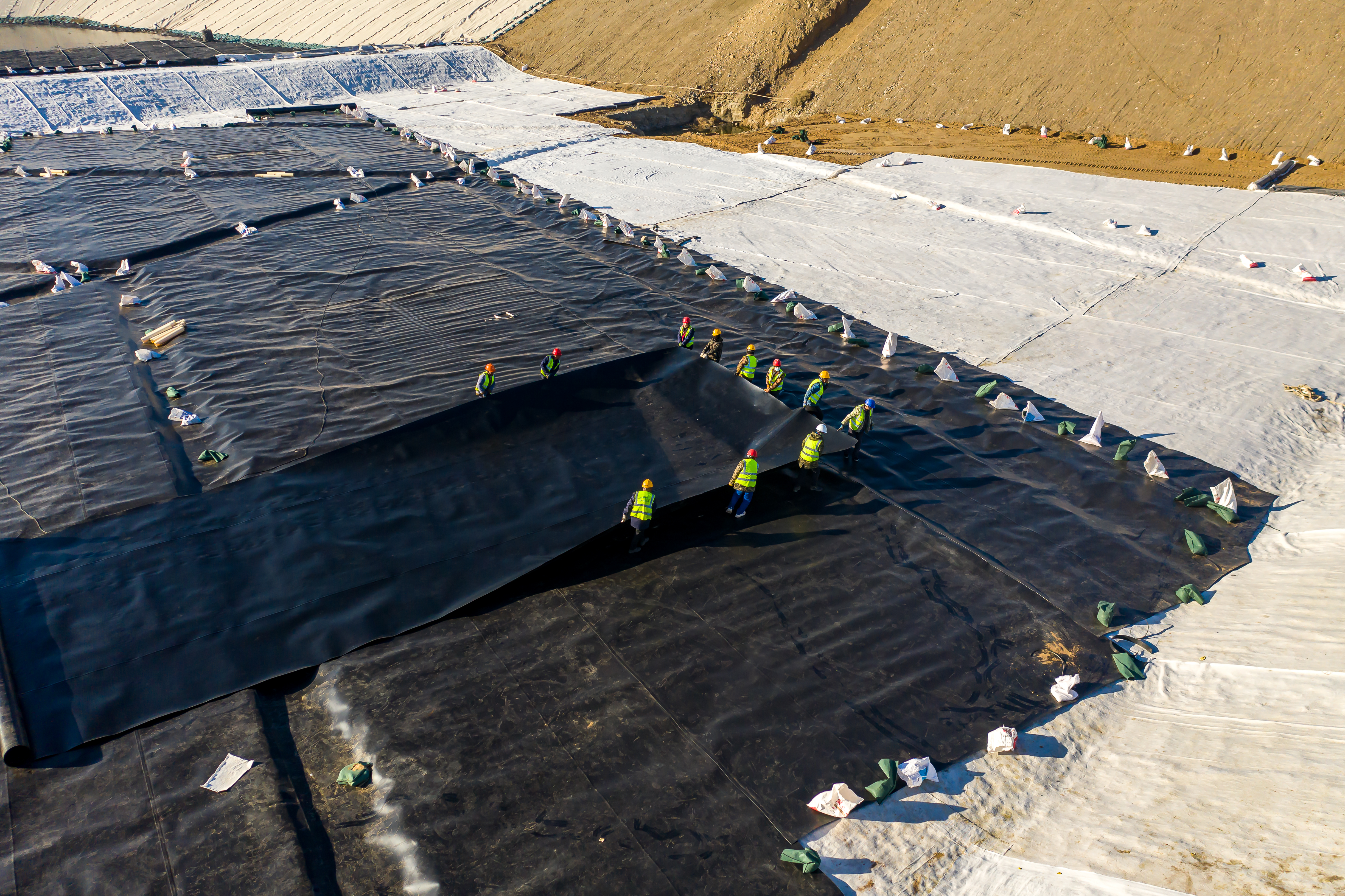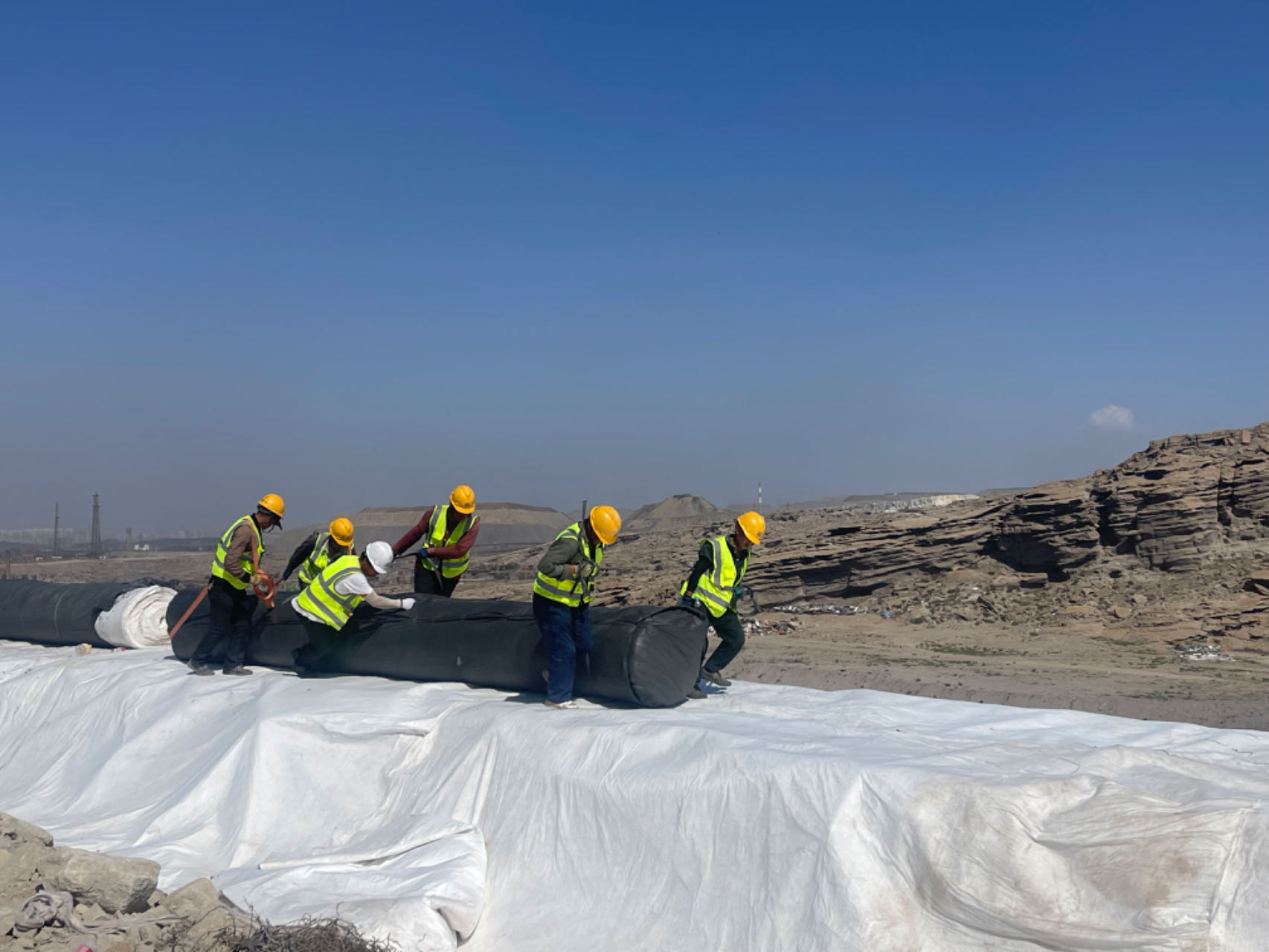秋更深了,風沙席卷中,烏海垃圾處理新建工程項目部緊繃“安全弦”,以時不我與,時不我待的精神拉滿施工進度條,迎來垃圾消納場最為關鍵的工序——鋪設地下防滲層。大家使勁,再加把勁!施工現場,數十名施工人員站成一排,正擼起袖子推動著一大卷黑膜向前行。他們個個頭戴安全帽,身穿反光背心,衣服都已被汗水打濕,雙肩和領口處結滿了汗水蒸發后留下的白色鹽霜。