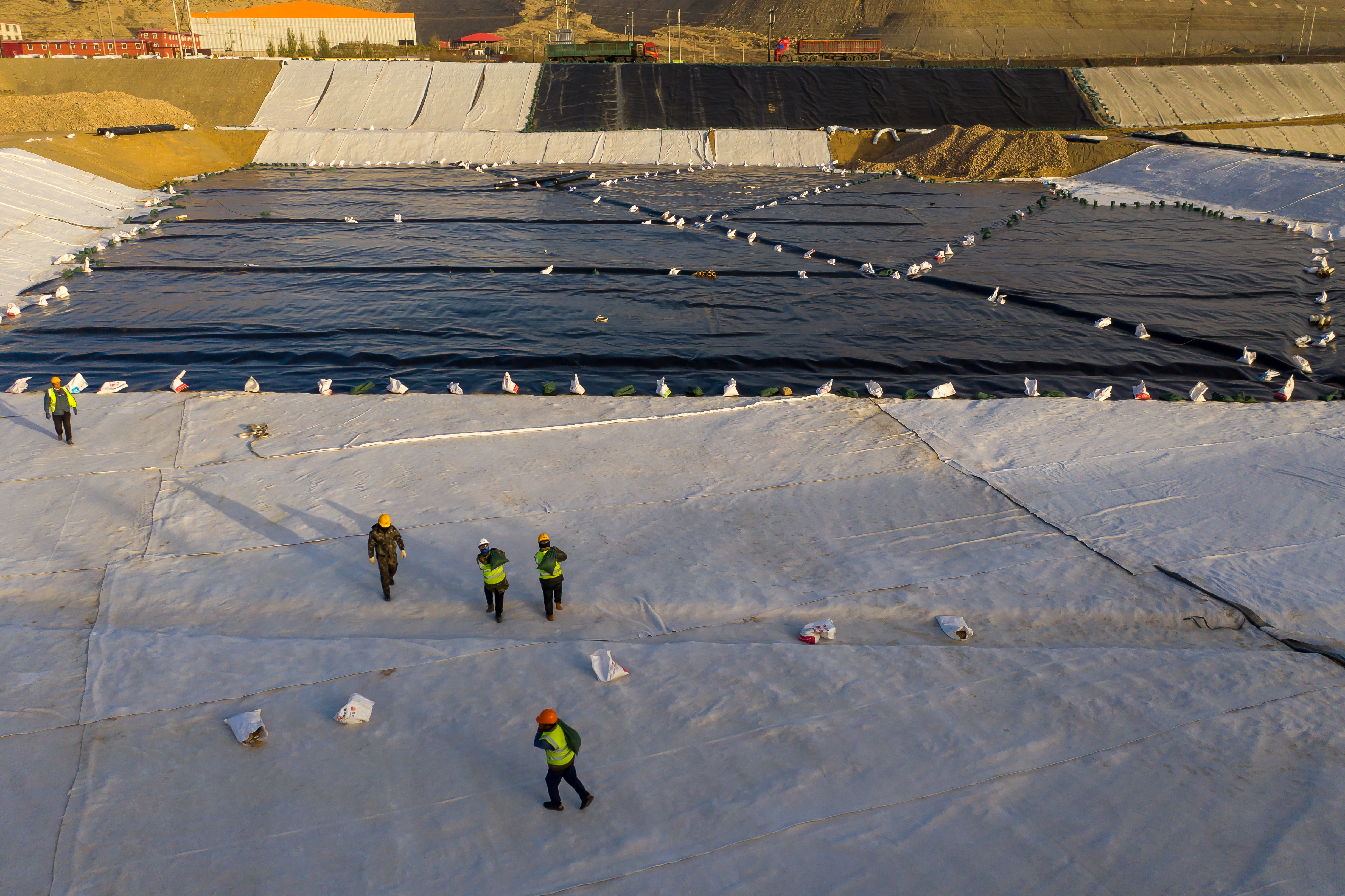 入秋以來,本就常年大風的烏海市海渤灣區,接連刮起五六級強風,氣溫驟然下降,但卻絲毫不減施工現場的火熱。一輛輛挖掘機、運輸車在大風和黃沙間穿行,機械設備轟鳴運轉,6名施工人員正拉拽一卷8米寬的防水卷材徐徐向前。垃圾消納場地表需要鋪設這種特制防水膜,每卷重量達1.3噸,由于吊車不能駛入防水層,材料運抵后只能肩挑人扛入場。烏海項目部安質環部負責人李宗宣說道。